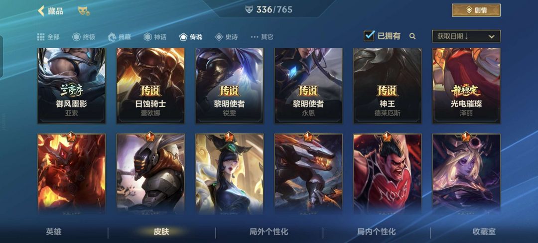 可排位336皮4神话36传说5级信誉有众多高质量限定皮肤截不完基本上都有皮肤。
