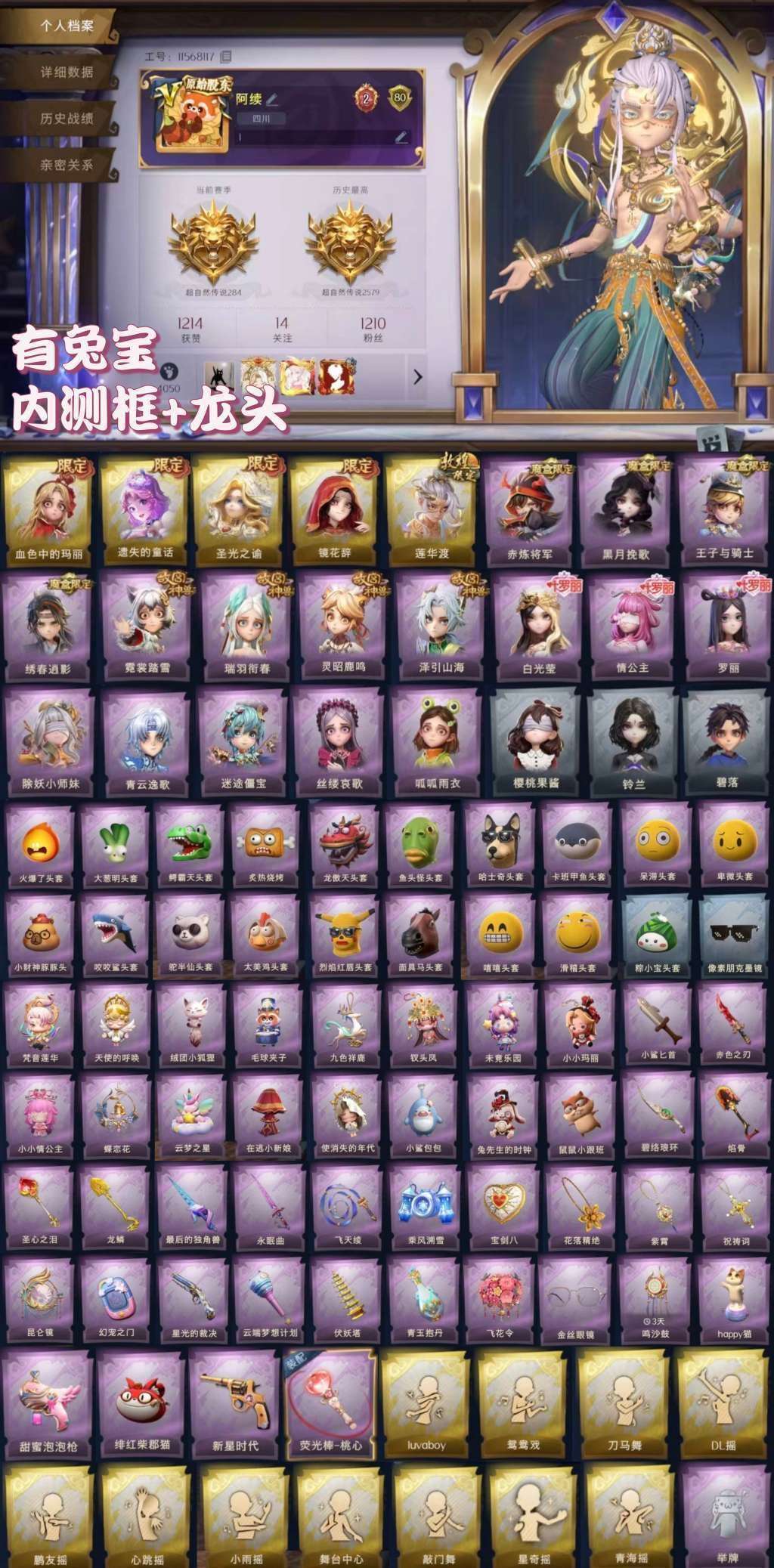 有兔宝 5金16紫⭐莲华渡⭐赤练将军⭐圣光之谕⭐双内测皮⭐龙头⭐23紫色道具⭐小师妹⭐白泽