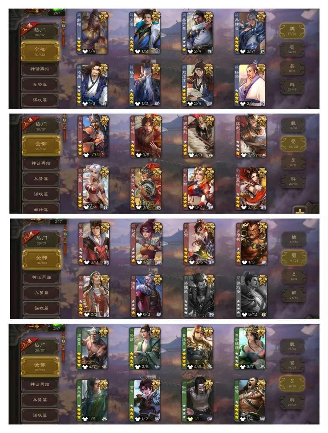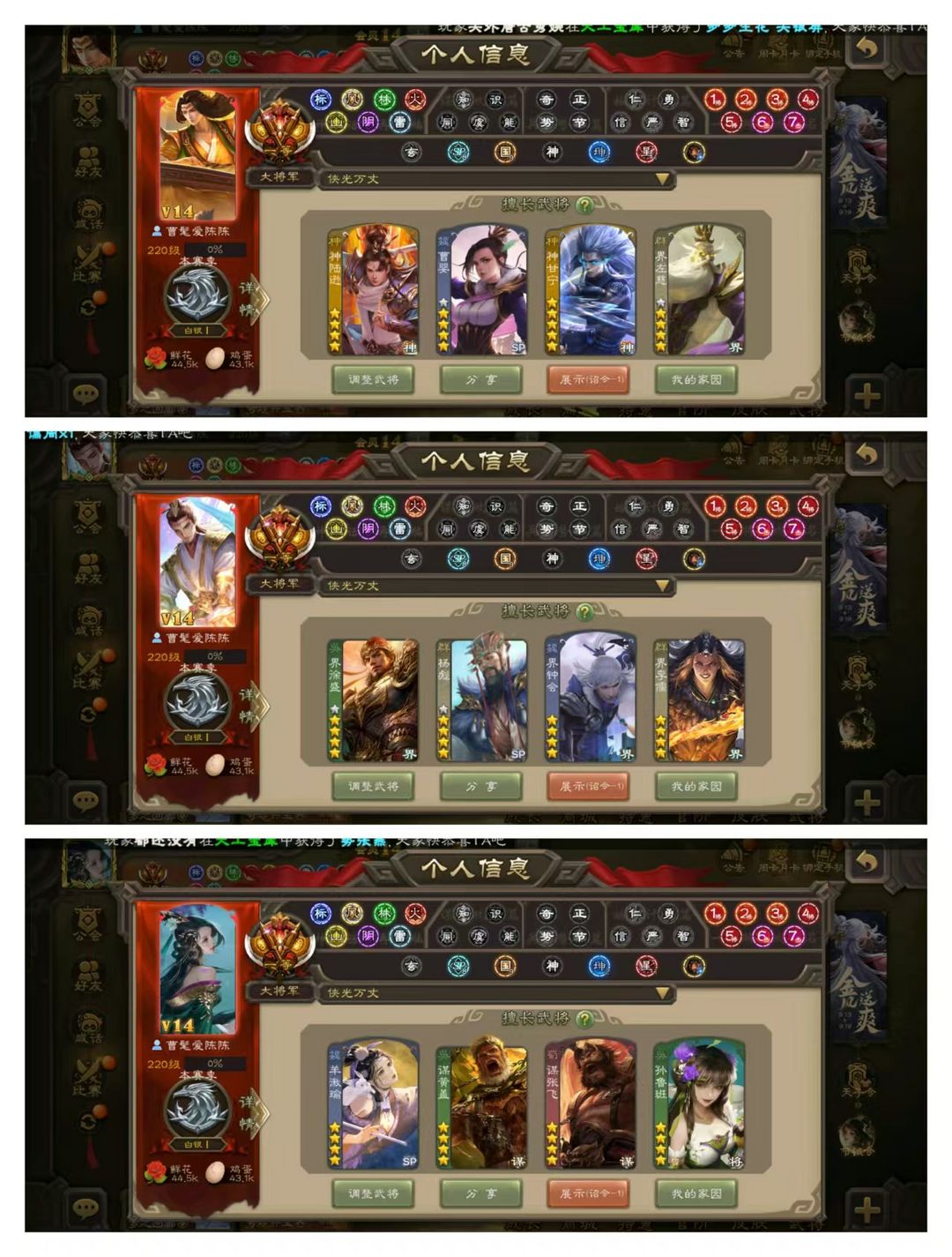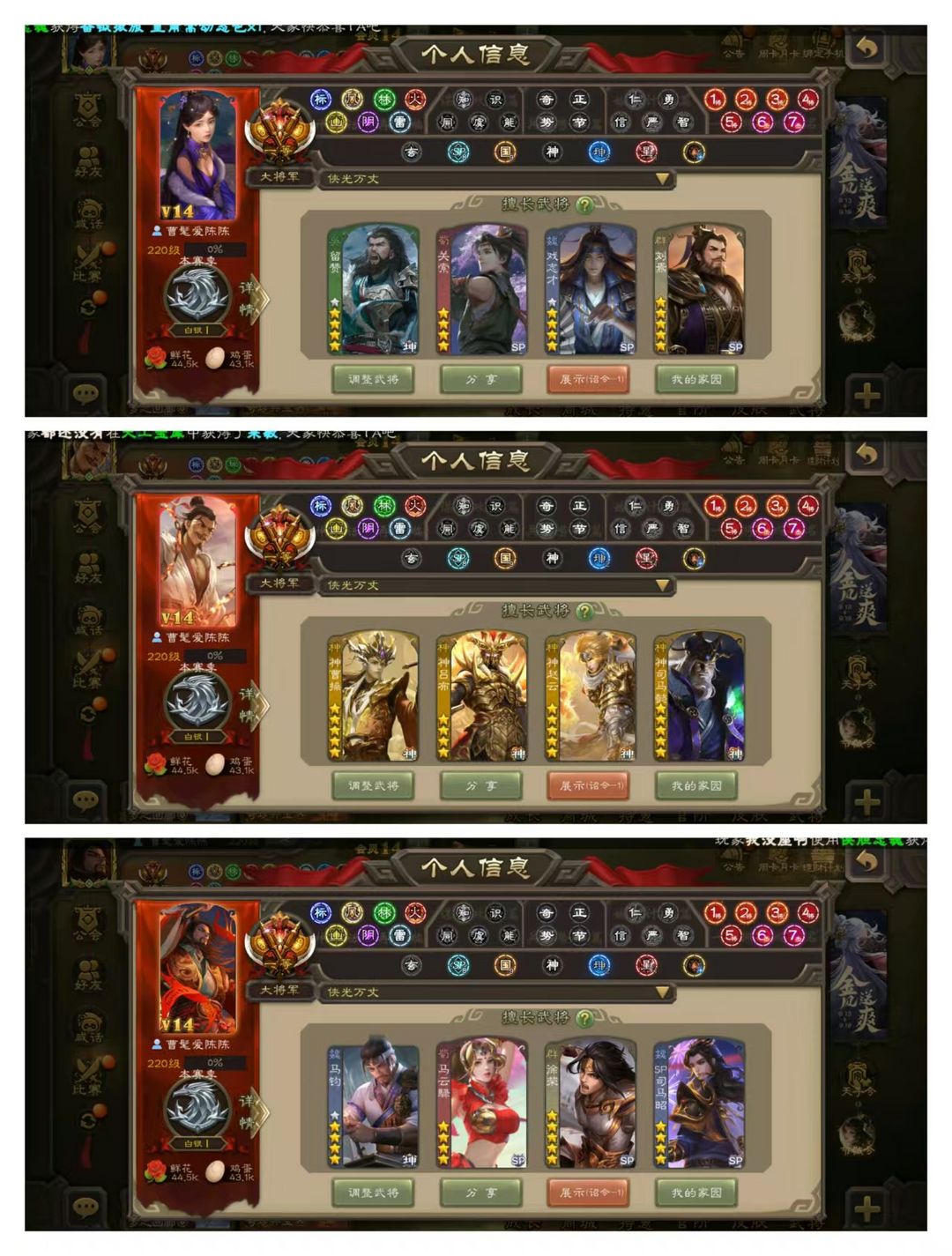 官方一等大将军,无卡,VIP14! 4五星炎龙:动刘焉动神曹操动神甘宁动神司马懿! 22四星玉龙:留赞关索司马昭徐荣动皮,神吕布陆逊曹婴动皮,马云禄手办动皮,金谋黄盖,司马师! 70史诗武将,12神将,羊徽瑜界钟会左慈戏志才动皮,星甘宁庞德公动皮,杨彪王元姬马钧界徐盛金皮,许攸张星彩司马徽金皮,杜预南华老仙周群等! 65动皮156金皮235国战皮肤!