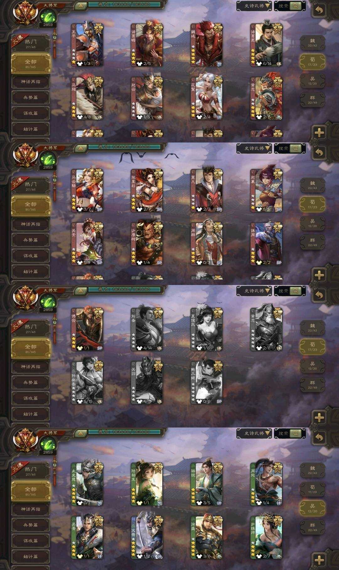 史诗武将(蜀国):势魏延,谋诸葛亮,谋赵云,傅佥,沙摩柯,关索,周群,花鬟,谯周,张星彩,王平,诸葛瞻,界黄忠,马云禄,董允,赵襄,谋马超