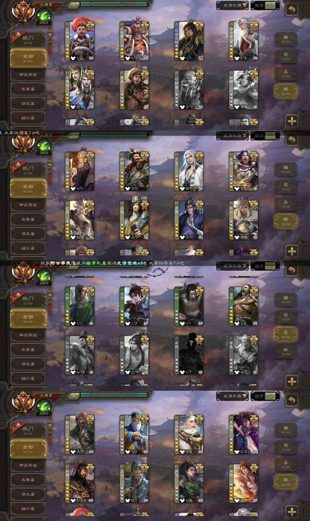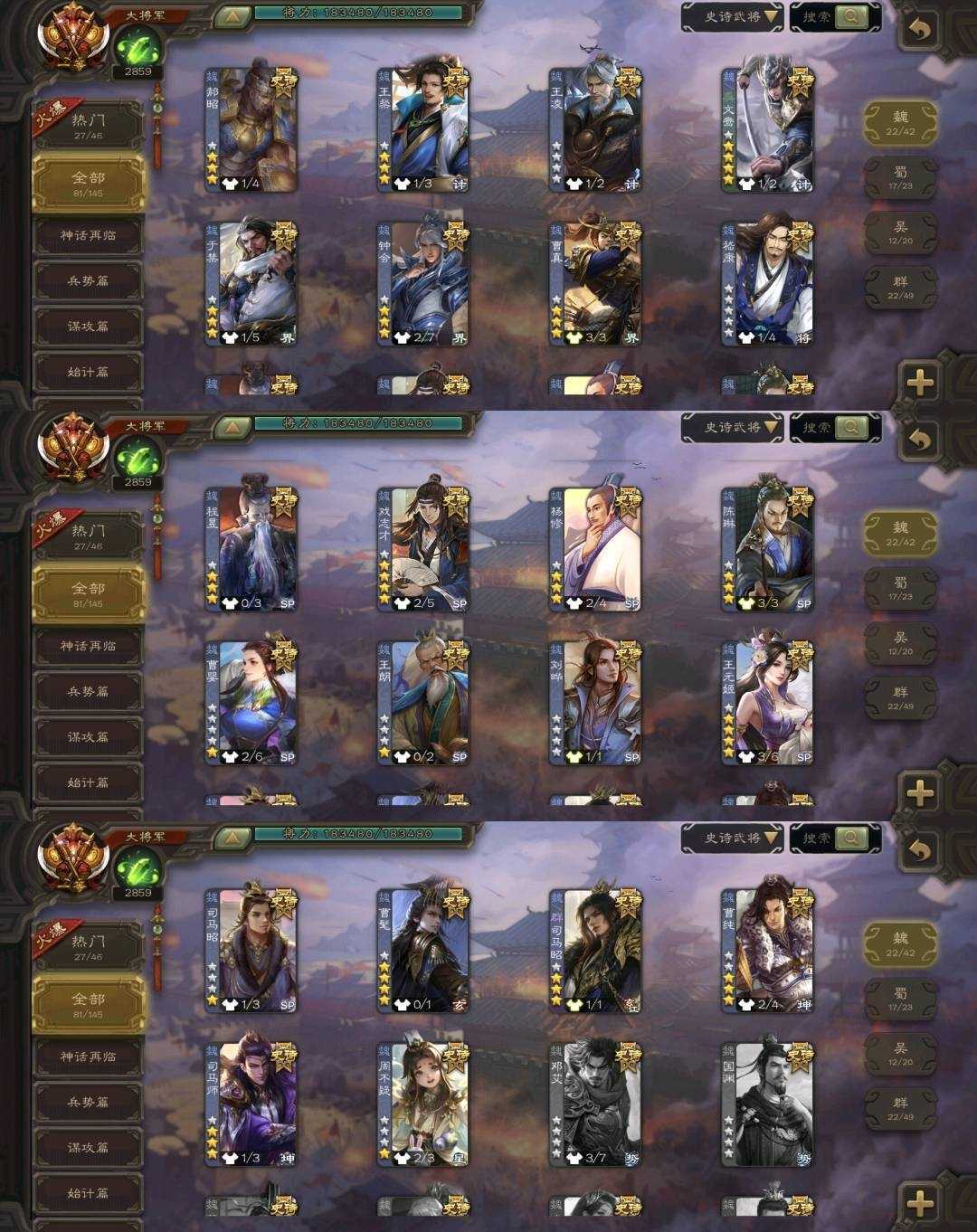 史诗武将(魏国):文鸯,曹髦,曹婴,王元姬,界钟会,戏志才,司马昭,王朗,SP司马昭,司马师,星周不疑,王凌,界曹真,嵇康,杨修,陈琳,刘晔,王粲,界于禁,程昱,曹纯,郝昭
